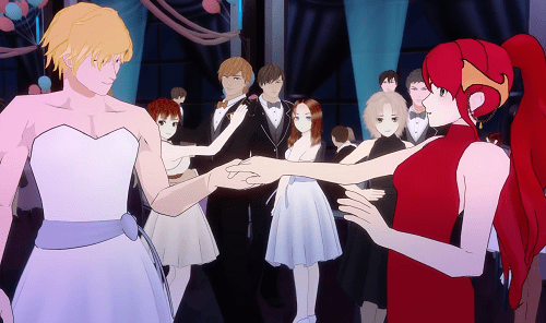 Jaune goes and puts on a dress. Returning to the dance, he spends the rest of his evening with Pyrrha. This moment is what officially sets their relationship into motion in cannon.