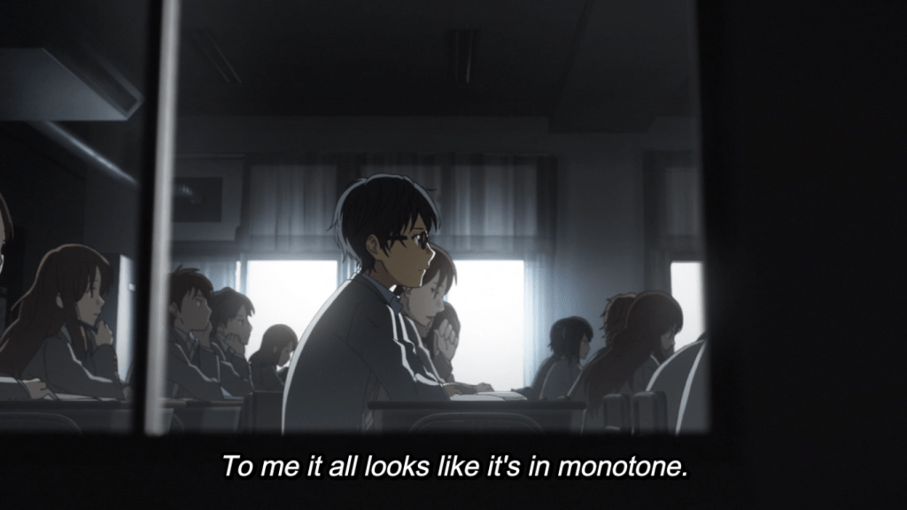At the beginning of the anime, about halfway into the episode Arima describes how he experiences the world. To him it is a place full of monotone. The vibrancy and thrill of life itself is something he just can see for himself anymore. This is a metaphor for a slew of deeper issues, but on a surface level saying he’s chronically depressed isn’t an understatement.