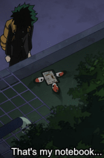 The conflict he has within himself about whether or not he should give up speaks volumes about who he is as a character. There’s something to be said for the way a very disenfranchised Deku lifts his notebook from the water, angry and hurt. From having been bullied, told to jump and end himself, to having the one thing he cares about the most tossed aside, there’s little more than true humanity in these moments.